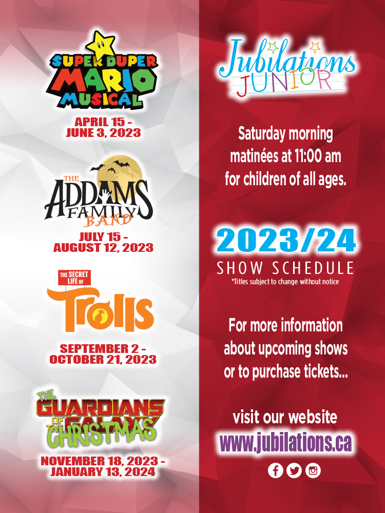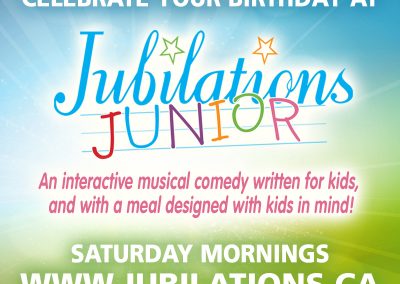 Jubilations Junior is a production written for kids and a meal designed with kids in mind! Join us for a fun-filled morning of laughter, music and food! Prices include a two-act musical comedy, and a family-friendly three-course meal.